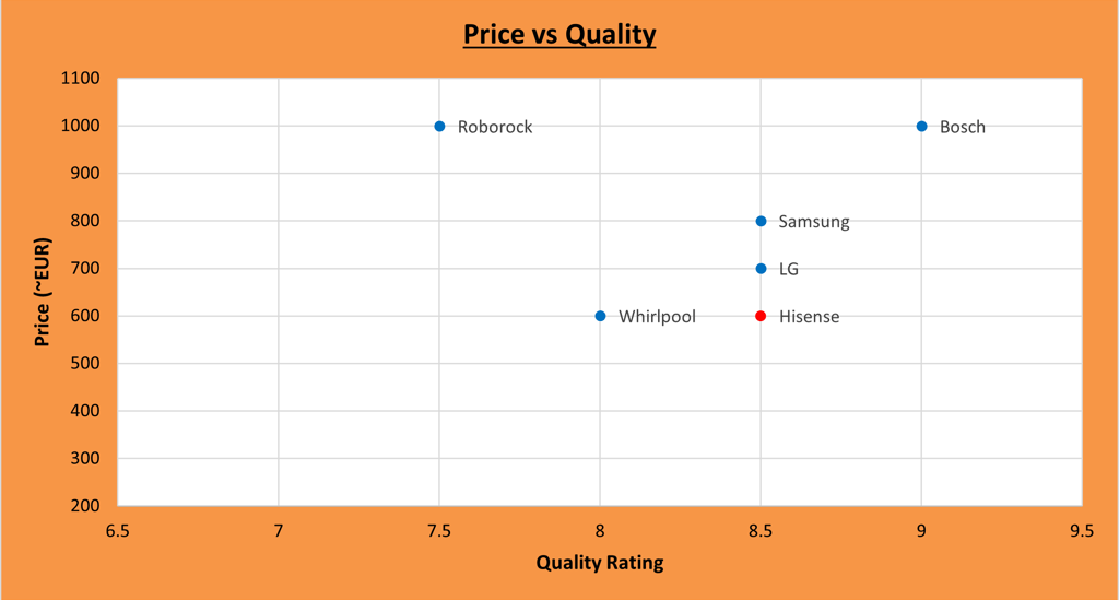 To highlight the value of our recommended machine compared to market offering, we resort to our comparative analysis where we illustrate our estimated performance quality ratings against the approximate market price. In this comparison, we consider five other washer dryer combinations from renowned manufacturers, namely Samsung WD80T554ABT, Bosch WDU8H541EU, Whirlpool FFWDB 964369 WV EE, Roborock WD10001RR4Z and LG GD3R509S0. Our analysis is depicted in the chart below where the Hisense is marked in red.